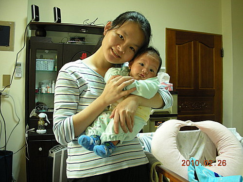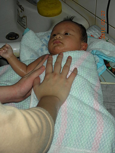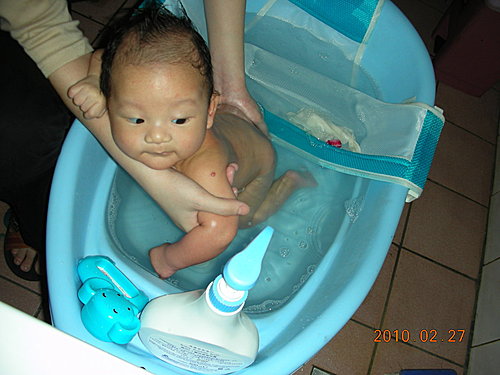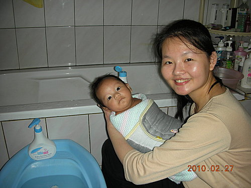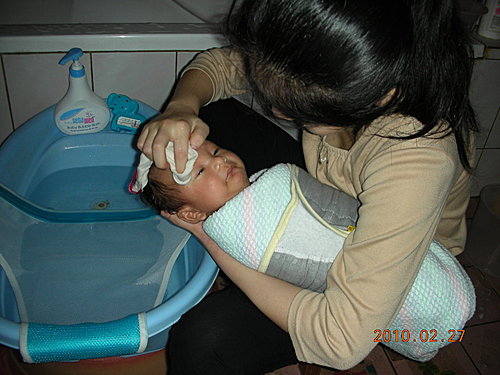 在與我的台傭眼神交流一下~~ (記得用橄欖球式抱小孩,左手托住嬰兒的頭,右手洗臉+頭髮)