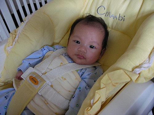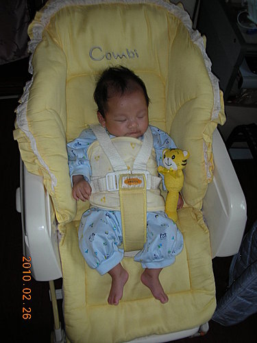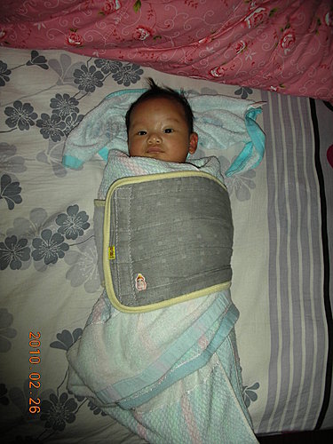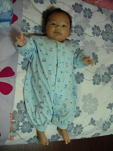 再來,媽媽把我抱回床上~瞧我的貝克漢頭~~是不是帥翻了~呵呵